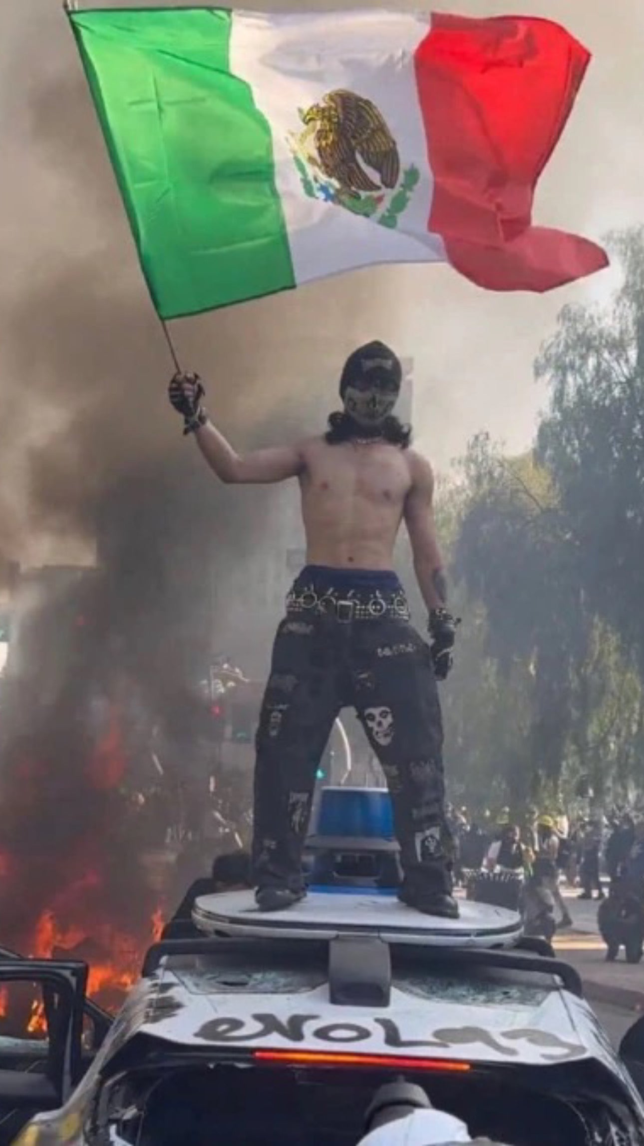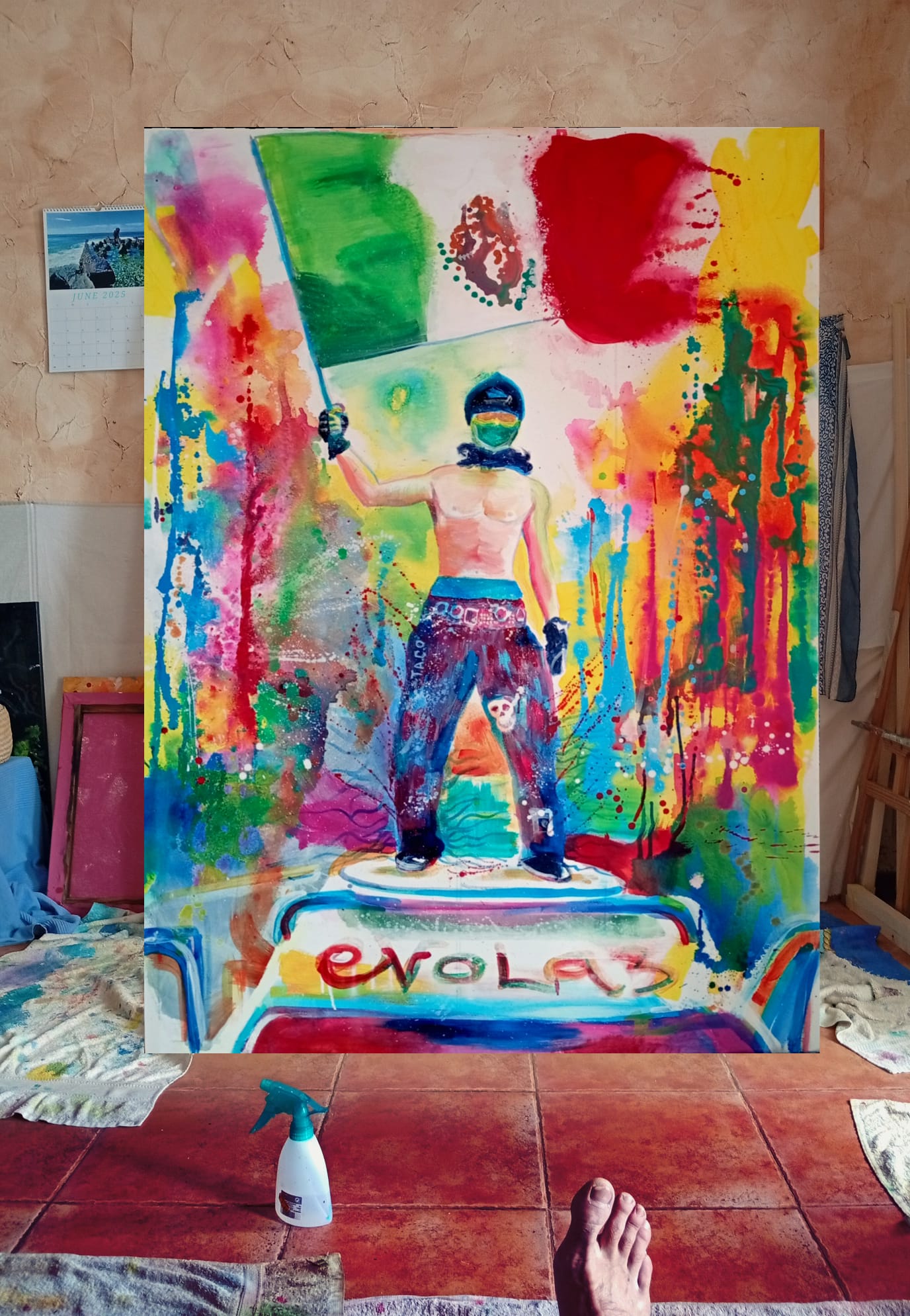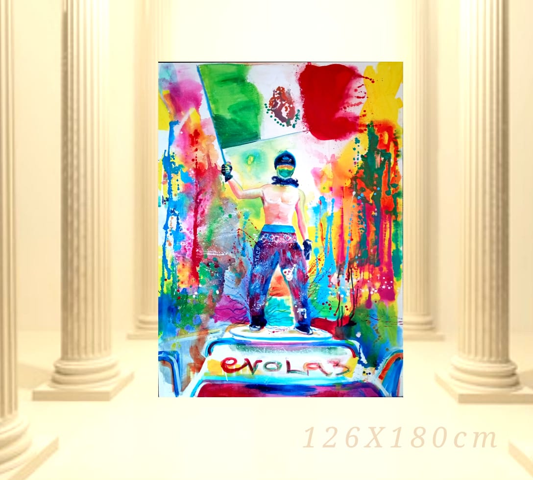 Inspirada en las históricas protestas contra el ICE de 2025 en Los Ángeles, "Resist" de Justin Moreno inmortaliza la imagen de un manifestante solitario, con cubrebocas y el pecho descubierto, izando la bandera mexicana sobre las llamas de la resistencia. Donde la foto original capturaba el caos puro, Moreno lo traduce en un derroche de color: cada gota, mancha y salpicadura de pintura evoca la energía de la rebelión, la urgencia de la identidad y el espíritu inquebrantable de quienes se oponen a la opresión.